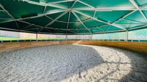18 m átmérőjű fedett homokos lovaskarám, körben a nézők a pályától leválasztva figyelhetik az eseményt. A helyszín kiváló lehetőséget nyújt rossz idő esetén is a lovas tréningek megtartására.